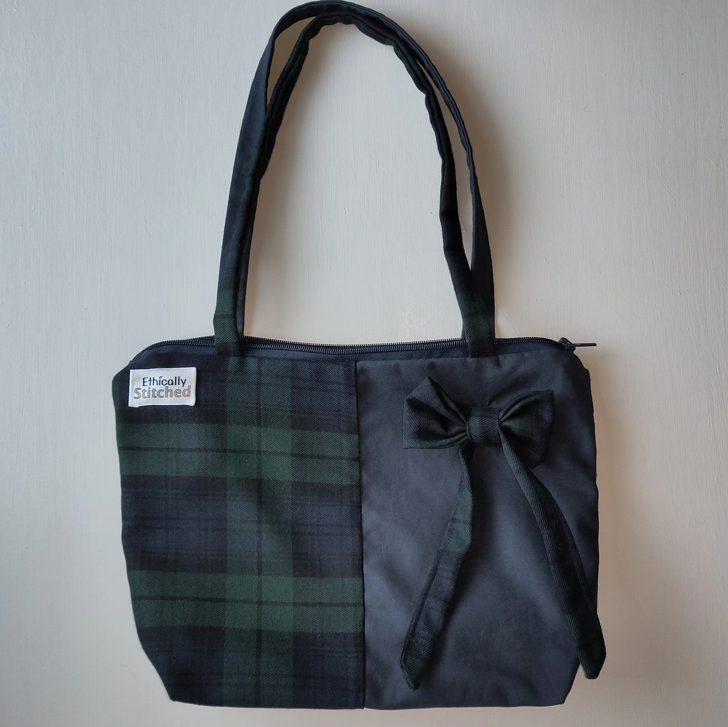 • Strap and outer fabric: pre-owned tartan polyester and pre-owned mid-weight cotton blend fabric